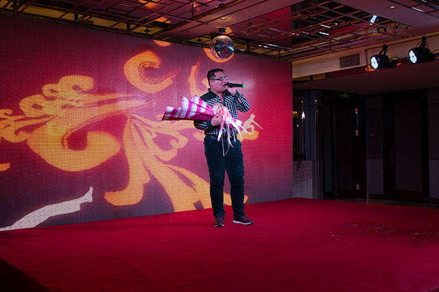 第二環(huán)節(jié)是生產(chǎn)制造部林秋楓的脫口秀《生活真煩惱》,搖身一變知心大姐和我們嘮嘮家長里短生活煩惱,最后一曲《社會搖》結(jié)束了“生活的煩惱”。不得不佩服林姐的好口才啊!今年晚會節(jié)目的“亮眼之作”小品《綁匪》,真是讓人眼前一片那啥?。ù颂幨÷圆徽f)。營銷部的賈殿鵬和市場部的王元峰為了節(jié)目也是蠻拼的啦。賈經(jīng)理那一頭金色長發(fā)、和王經(jīng)理那喜慶的肚兜兒,相信大家還是記憶猶新吧!集驚悚、懸疑、搞笑于一身的小品過后,在工程技術(shù)部夏寰宇的一首《你是我的眼》的歌聲中節(jié)目告一段落。之后游戲《看數(shù)字猜成語》、《背連背,心連心》火熱進行。同時由領(lǐng)導抽取幸運二等獎并頒發(fā)獎項。